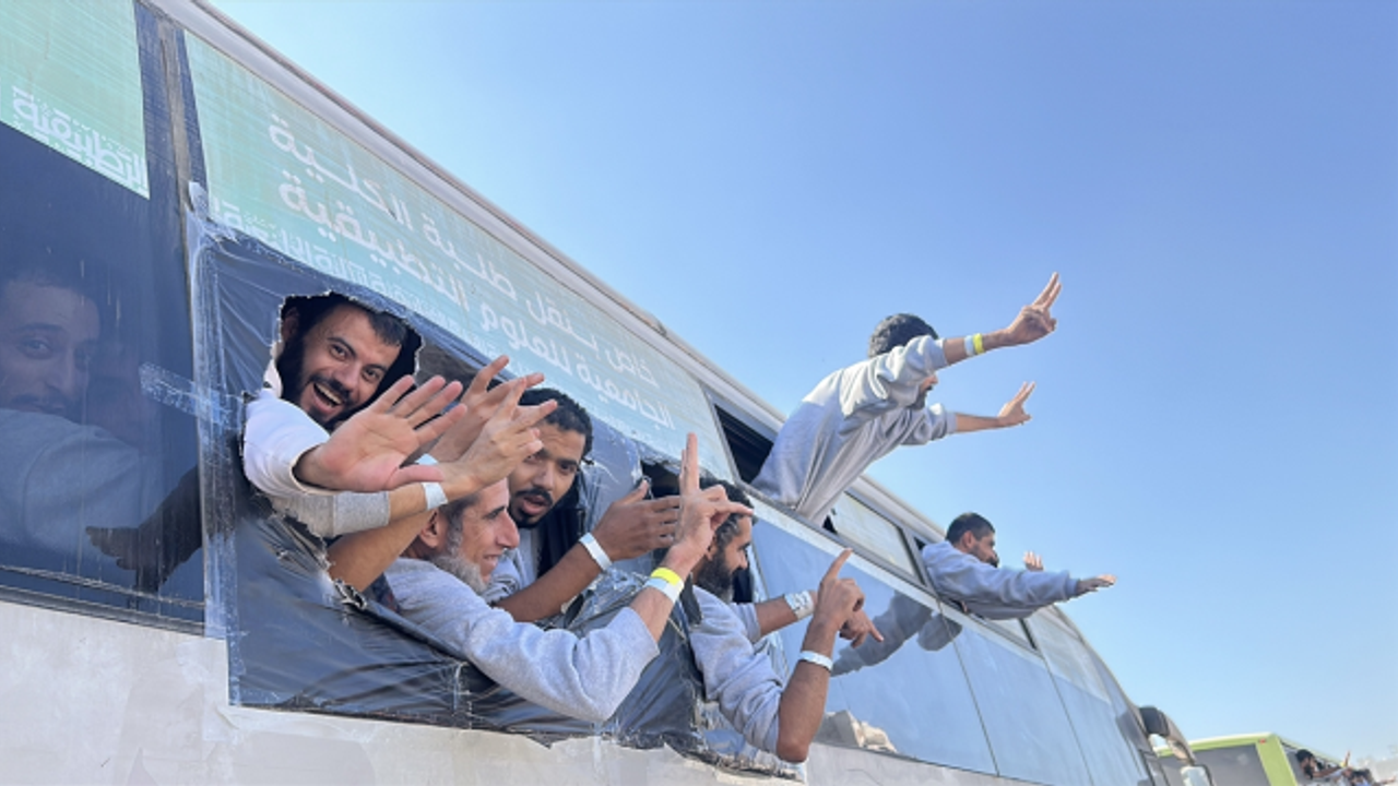 Uluslararası Kızılhaç aracılığıyla serbest bırakılan Filistinli esirler, Kerem Ebu Salim Sınır Kapısı'ndan otobüslerle Gazze Şeridi'ne geldi.