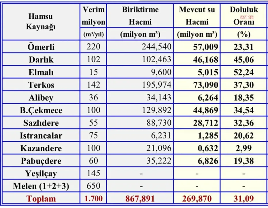 İSKİ verilerine göre, İstanbul’un 11 barajında su seviyeleri alarm veriyor. Kazandere Barajı’nda doluluk oranı yüzde 2,99’a kadar geriledi. Alibey Barajı yüzde 18,35, Pabuçdere Barajı yüzde 19,38, Ömerli Barajı yüzde 23,31 seviyesinde bulunuyor. Doluluk oranı en yüksek baraj ise yüzde 52,24 ile Elmalı Barajı oldu. İstanbul genelinde toplam mevcut su hacmi 269 milyon 870 bin metreküp olarak ölçüldü.