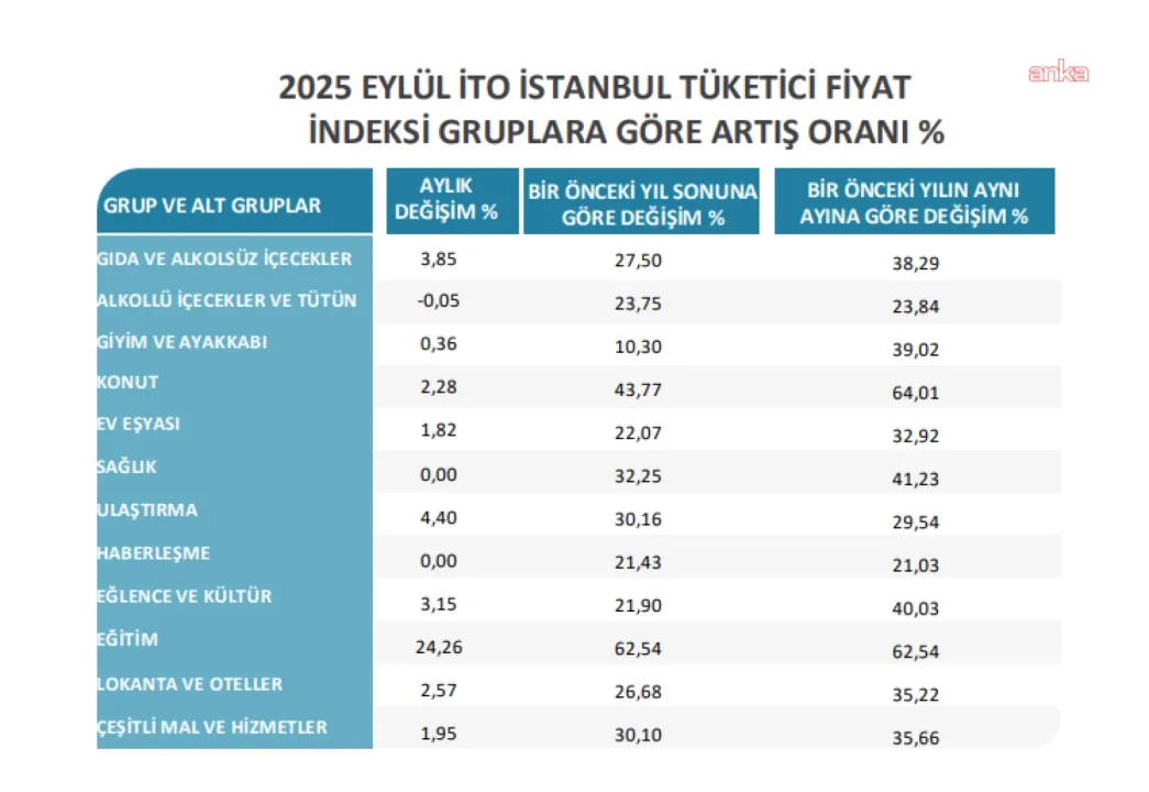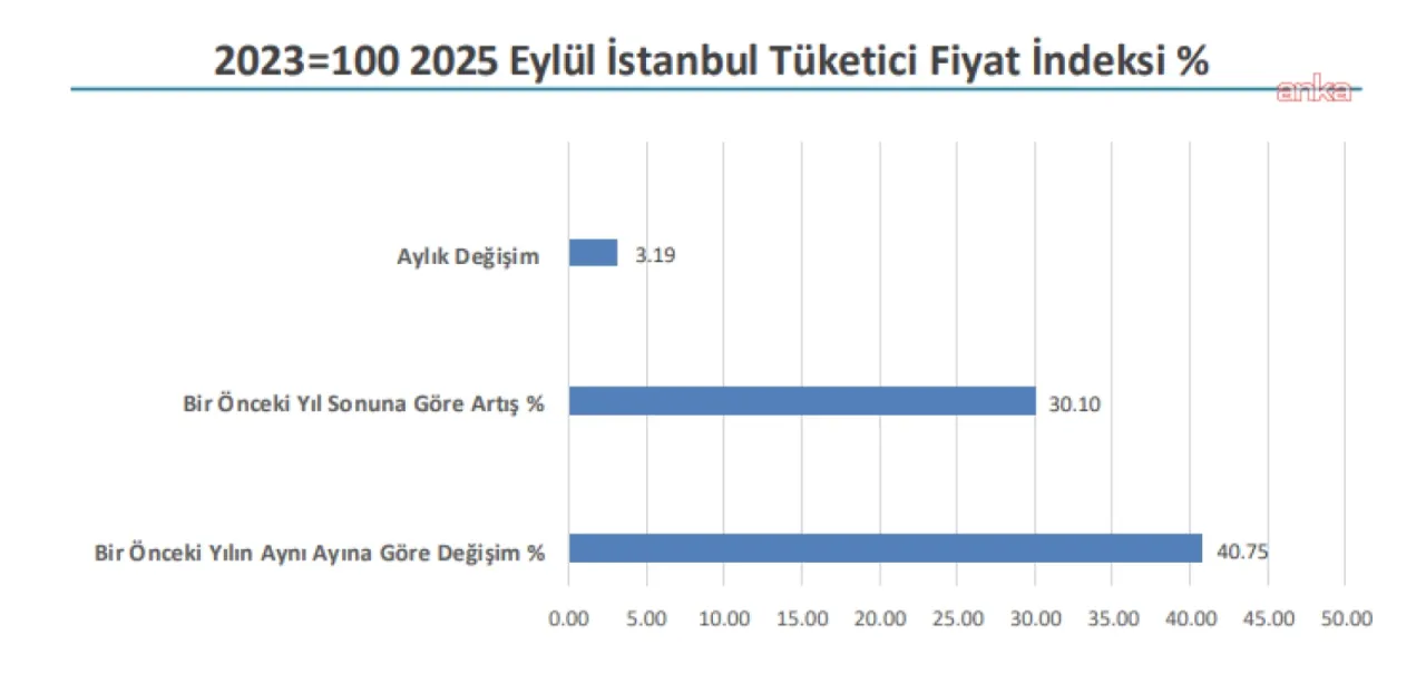 İTO 2025 Eylül ayı İstanbul Tüketici Fiyat Endeksi verilerini açıkladı. Buna göre, eylül ayında İstanbul’da perakende fiyat hareketlerinin göstergesi olan İTO İstanbul Tüketici Fiyat İndeksi aylık artışı yüzde 3,19 olarak gerçekleşti. Geçen yılın eylül ayına göre 2025 Eylül ayında İstanbul’da yaşanan fiyat değişimlerini gösteren bir önceki yılın aynı ayına göre değişim oranı İTO 2023=100 bazlı İTO İstanbul Tüketici Fiyat İndeksi yüzde 40,75 oldu.