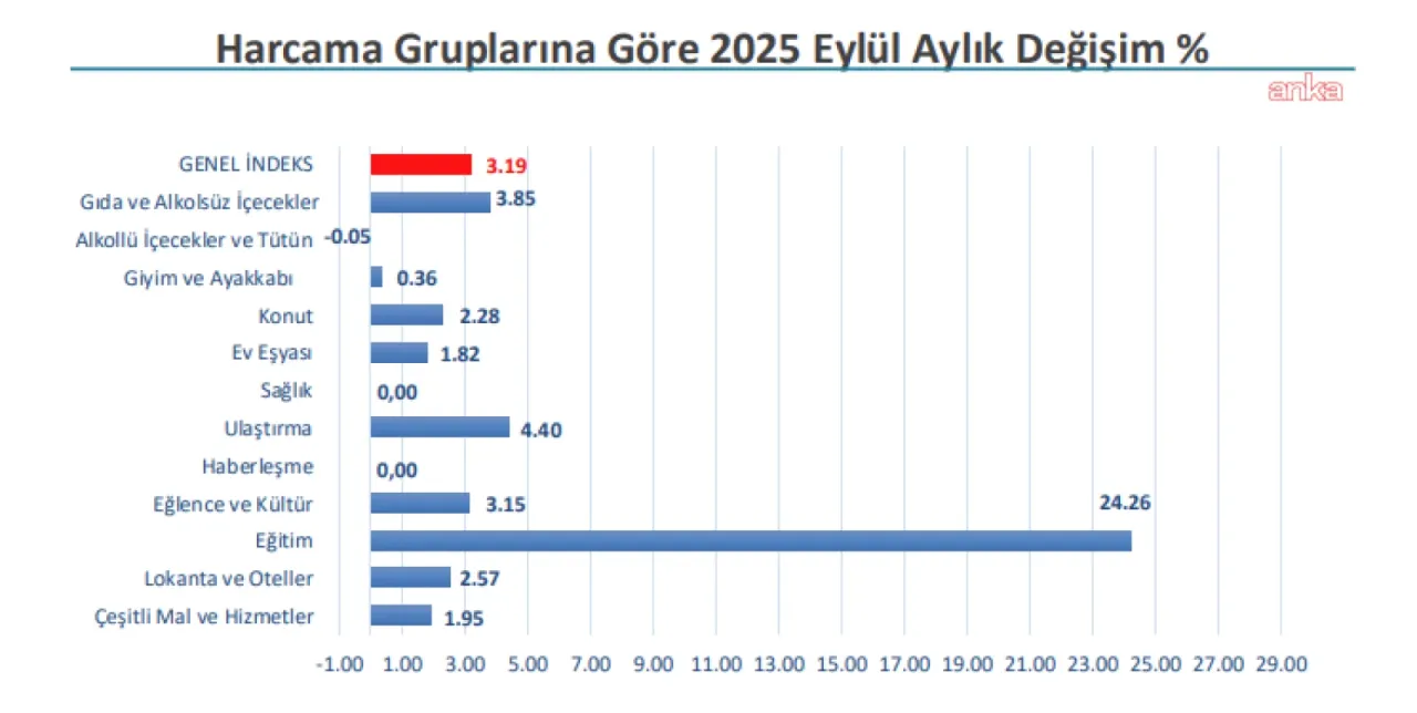 Eylül ayında İstanbul Tüketici Fiyat İndeksinde; bir önceki aya göre eğitim harcamaları grubunda yüzde 24,26, ulaştırma harcamaları grubunda yüzde 4,40, gıda ve alkolsüz içecekler harcama grubunda yüzde 3,85, eğlence ve kültür harcamaları grubunda yüzde 3,15, lokanta ve oteller harcama grubunda yüzde 2,57, konut harcamaları grubunda yüzde 2,28, çeşitli mal ve hizmetler harcama grubunda yüzde 1,95, ev eşyası harcamaları grubunda yüzde 1,82, giyim ve ayakkabı harcamaları grubunda ise yüzde 0,36 artış, alkollü içecekler ve tütün harcama grubunda yüzde -0,05 azalış görüldü. Haberleşme ve Sağlık Harcamaları gruplarında fiyat değişimi izlenmedi.