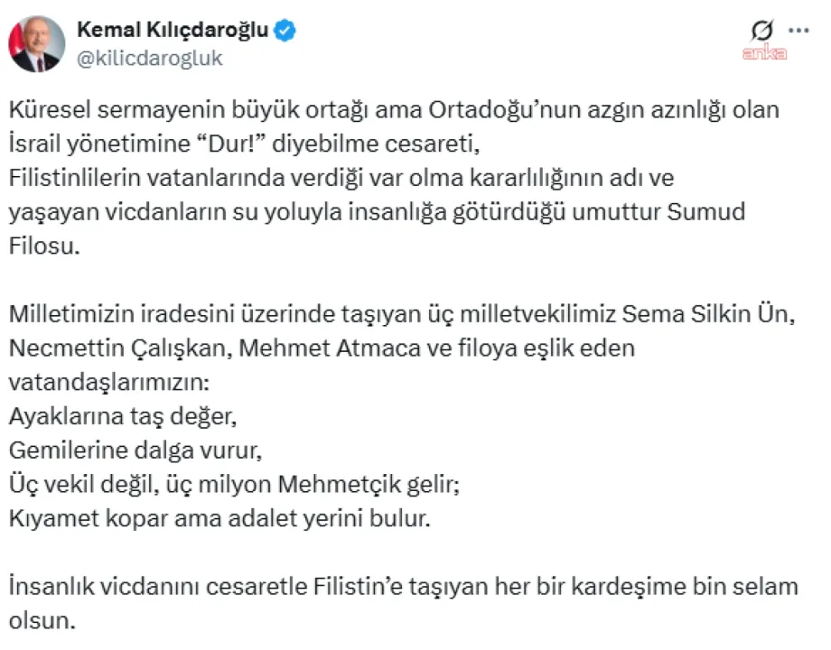 "Küresel sermayenin büyük ortağı ama Orta Doğu’nun azgın azınlığı olan İsrail yönetimine 'Dur!' diyebilme cesareti, Filistinlilerin vatanlarında verdiği var olma kararlılığının adı ve yaşayan vicdanların su yoluyla insanlığa götürdüğü umuttur Sumud Filosu. Milletimizin iradesini üzerinde taşıyan üç milletvekilimiz Sema Silkin Ün, Necmettin Çalışkan, Mehmet Atmaca ve filoya eşlik eden vatandaşlarımızın ayaklarına taş değer, gemilerine dalga vurur, üç vekil değil, üç milyon Mehmetçik gelir; kıyamet kopar ama adalet yerini bulur. İnsanlık vicdanını cesaretle Filistin’e taşıyan her bir kardeşime bin selam olsun."