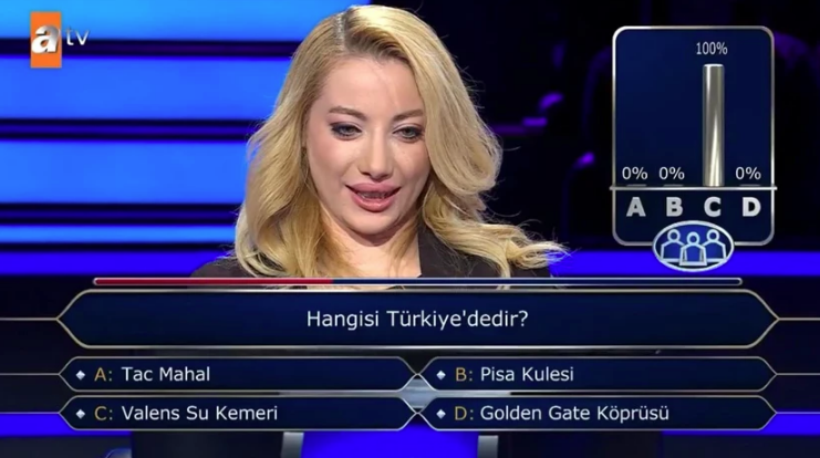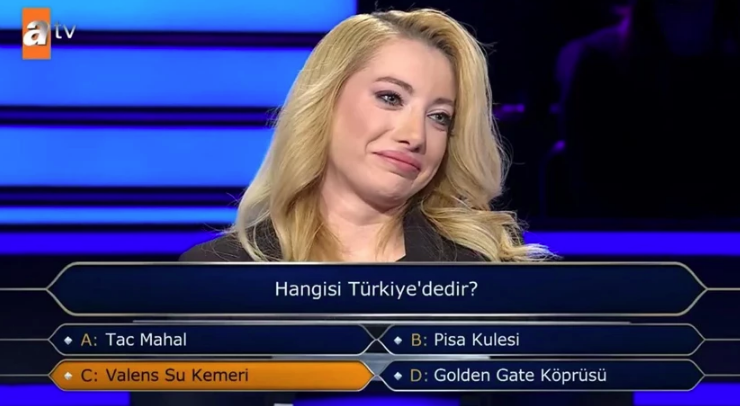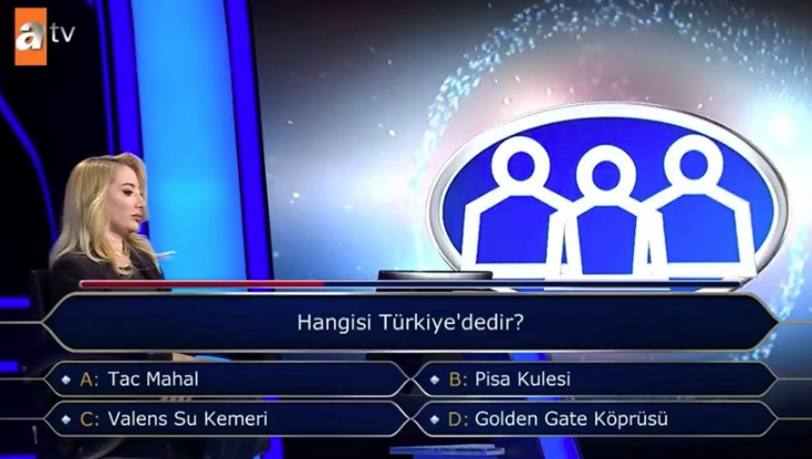 ATV’nin sevilen yarışma programında dün akşam ekrana gelen bölümde, Nesrin Ulus isimli yarışmacıya 10 bin TL değerindeki dördüncü soru olarak “Hangisi Türkiye’dedir?” sorusu yöneltildi. Şıklarda Tac Mahal, Pisa Kulesi, Valens Su Kemeri ve Golden Gate Köprüsü yer alıyordu.