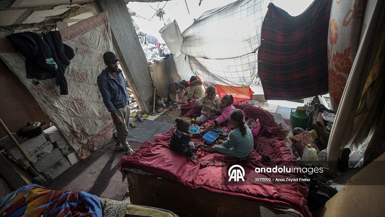 İsrail'in saldırıları sonucu Gazze kentinin Şeyh Rıdvan Mahallesi'ndeki evlerinin bir bölümü yıkılan Filistinli Hamdan Ramazan ailesi, kışı enkaz halindeki evlerinde karşılıyor. Kalacak başka yerleri olmayan 6 kişilik Ramazan ailesi, soğuktan korunmak için evin açık yerlerini örtü ve naylon parçalarıyla kapatıyor. Aile, soğuk hava ve zor koşullarla mücadele ederek yaşamını sürdürmeye çalışıyor.