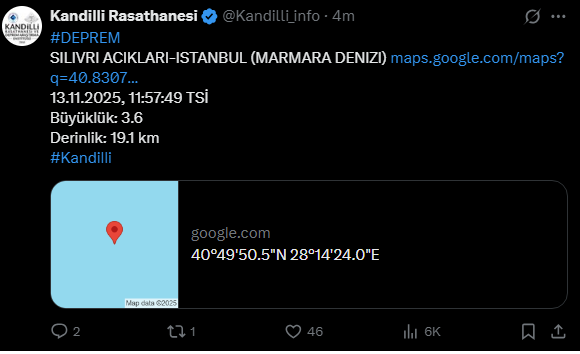 Kandili Rasathanesi tarafından yapılan açıklamada Marmara denizinin Silivri açıklarında 3.6 büyüklüğünde deprem meydana geldi.