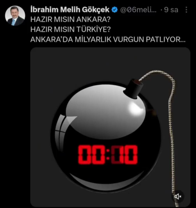 Melih Gökçek, sosyal medyadan saatli bomba ve geri sayım görseliyle yaptığı paylaşımda, "Hazır mısın Ankara? Hazır mısın Türkiye? Ankara'da milyarlık vurgun patlıyor" ifadelerini kullandı. Bu paylaşım üzerine, "Operasyonu önceden mi biliyordu?" soruları gündeme geldi.
