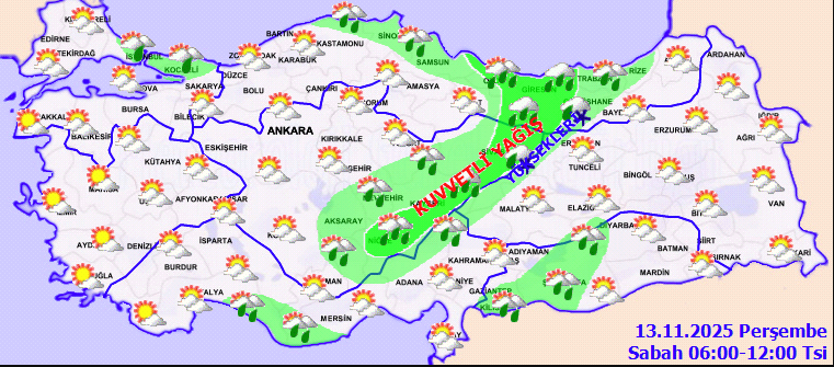 Meteoroloji Genel Müdürlüğü tarafından yayınlanan son hava raporuna göre, Ülkemiz genelinin parçalı ve çok bulutlu, Marmara’nın doğusu, Orta ve Doğu Akdeniz, İç Anadolu’nun güney ve doğusu, Karadeniz, Doğu Anadolu’nun kuzey ve batısı, Güneydoğu Anadolu’nun batısı ile Antalya, Bingöl ve Diyarbakır çevrelerinin yağmur ve sağanak yağışlı, Doğu Karadeniz’in iç kesimlerinin yüksekleri ile Doğu Anadolu’nun kuzey kesimlerinin yükseklerinin karla karışık yağmur ve yer yer kar yağışlı geçeceği tahmin ediliyor. Yağışların, Niğde, Kayseri, Sivas, Samsun, Ordu ve Giresun çevrelerinde yer yer kuvvetli olması bekleniyor.