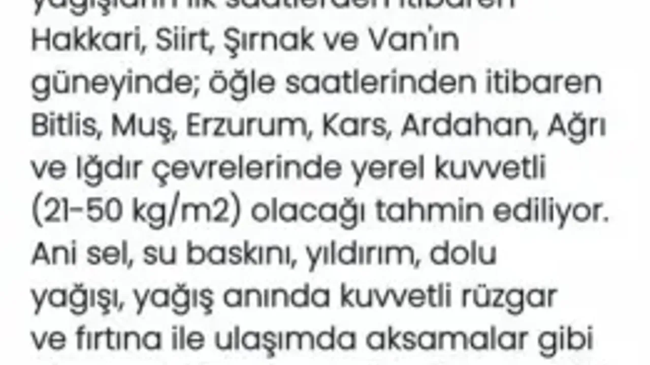 Doğu ve Güneydoğu'daki bazı illerde kuvvetli yağış bekleniyor. Meteoroloji Genel Müdürlüğünün paylaştığı son verilere göre, sağanak ve gök gürültülü sağanağın Hakkari, Siirt, Şırnak ve Van’ın güneyi ile Bitlis, Muş, Erzurum, Kars, Ardahan, Ağrı ve Iğdır çevrelerinde yerel kuvvetli olacağı tahmin ediliyor. Yağışların neden olabileceği ani sel, su baskını, yıldırım, dolu yağışı, yağış anında kuvvetli rüzgar ve fırtına ile ulaşımda aksamalar gibi olumsuzluklara karşı yurttaşların dikkatli olmaları gerekiyor.