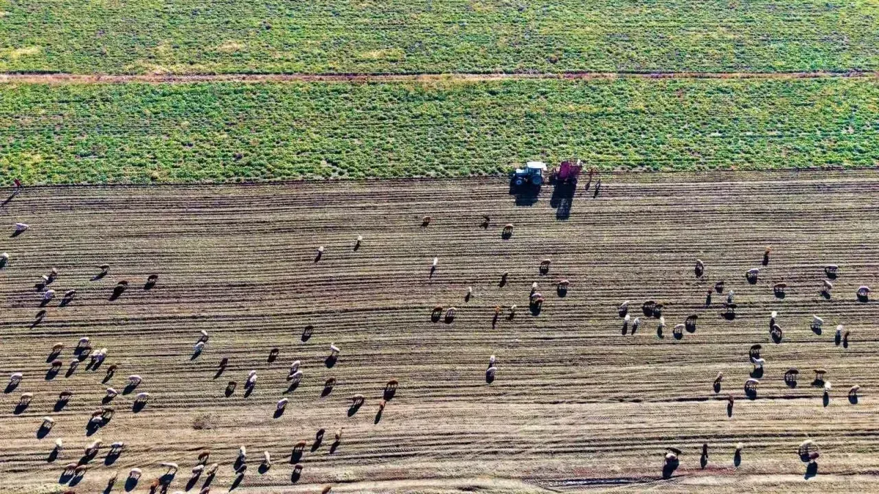 Dron görüntüleri, çiftçilerin yoğun çalışma temposunu ve tarlalardaki dayanışma örneğini gözler önüne serdi.