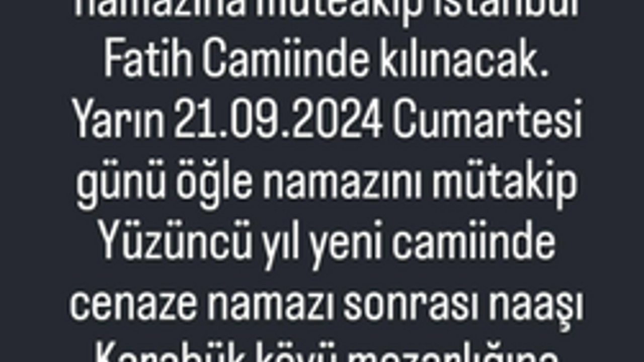 Sosyal medya hesabından üzücü haberi paylaşan Karataş, “Anneciğim Elif Karataş Cenaze namazı Cuma namazına müteakip İstanbul Fatih Camiinde kılınacak. Yarın 21.09.2024 Cumartesi günü öğle namazını mütakip Karabük Yüzüncü yıl yeni camiinde cenaze namazı sonrası naaşı Karabük köyü mezarlığına defnedilecektir” ifadeleriyle cenaze bilgilerine yer vermişti.
