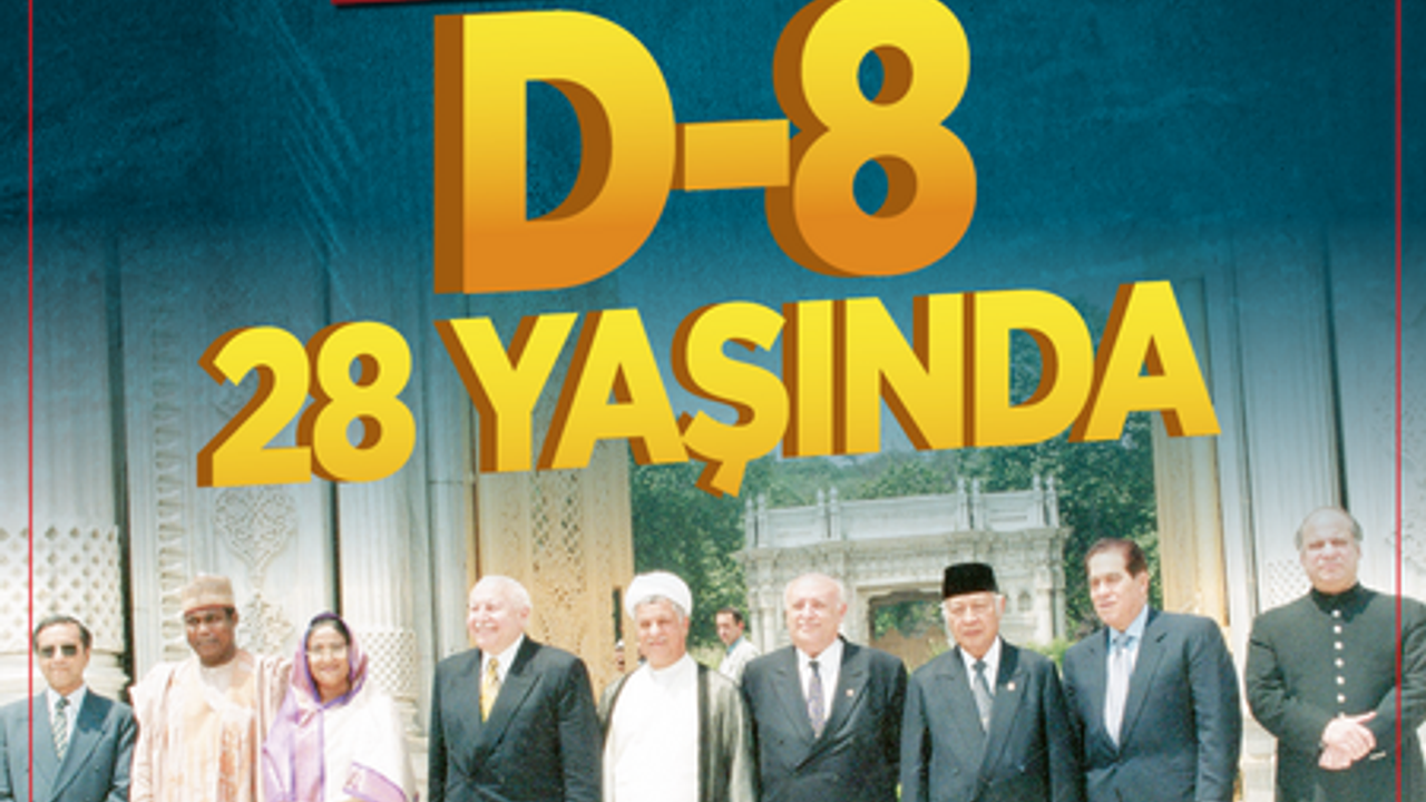 Türkiye, Bangladeş, Mısır, Endonezya, İran, Malezya, Nijerya ve Pakistan’ın üyesi olduğu, 15 Haziran 1997’de İstanbul’da düzenlenen Devlet ve Hükümet Başkanları Zirvesi’nde alınan kararla oluşturulan Gelişen Sekiz Ülke (D8) Ekonomik İşbirliği Örgütü, kuruluşunun 28. yılını kutluyor. Üye ülkelerin toplam nüfusu 1 milyarın üzerinde, toplam ekonomik büyüklükleri ise 4 trilyon doları aşan D8, Milli Görüş Lideri ve 54. hükümetin efsane başbakanı Prof. Dr. Necmettin Erbakan’ın ‘İslam Birliği’ni tesis etme’ fikriyatıyla uzun yıllar üzerinde çalıştığı titiz planları bir çatı altında topladığı evrensel bir proje olarak çok özel bir konumda yer alıyor.
