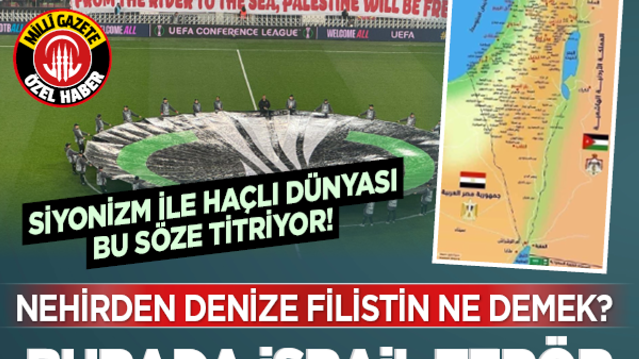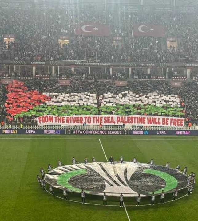 Stadyumun tamamında kartonlarla Filistin bayrağı oluşturan taraftarlar İngilizce, "Nehirden denize kadar Filistin özgür olacak" ifadesinin yazılı olduğu pankart açtı.