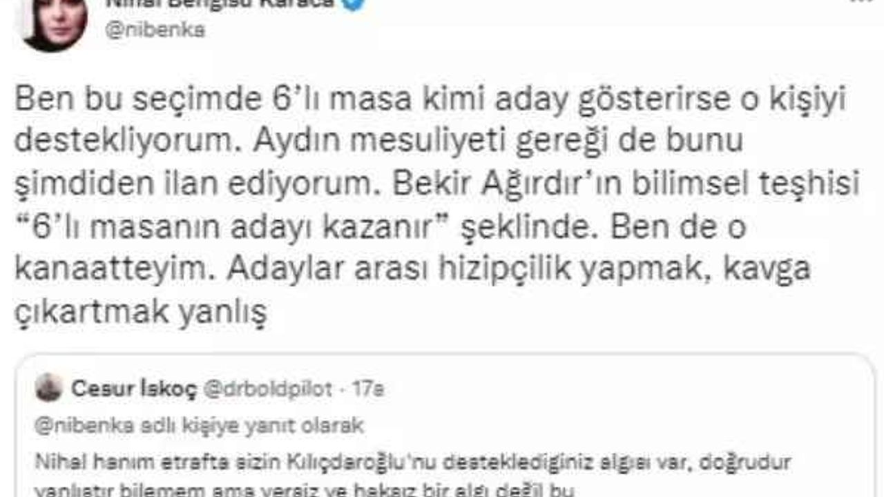 Altılı Masa'nın cumhurbaşkanı adayıyla ilgili tartışmalar kapsamında bir sosyal medya kullanıcısının, "Nihal hanım etrafta sizin Kılıçdaroğlu'nu desteklediğiniz algısı var, doğrudur yanlıştır bilemem ama yersiz ve haksız bir algı değil bu" şekline yanıt veren Karaca, paylaşımında şu ifadeleri kullandı:
