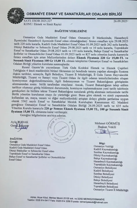Osmaniye Esnaf ve Sanatkarlar Odaları Birliği, Kadirli’de 220 gram ekmeğin fiyatını 15 liraya, 100 gram susamlı simitin fiyatını da 15 lira olarak belirledi.
