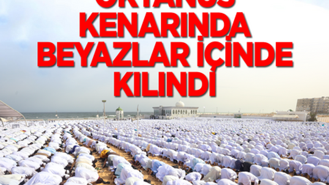 Okyanus kıyısındaki kumsalda saf tutan bembeyaz giyinmiş kadın, erkek ve çocuklardan oluşan cemaat, bayram namazını eda etti.