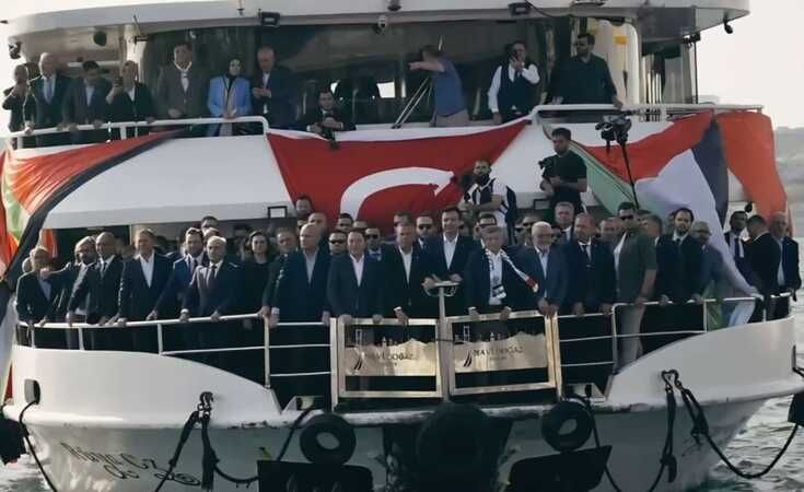 * Liderler ve katılımcıların bir kısmının gemilerle miting alanına ulaşması herkesin ilgisine mazhar oldu. Mavi Marmara ve Madleen gemilerine atıf olarak algılandı.