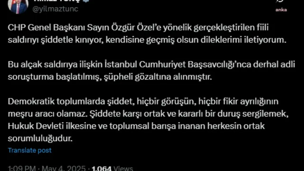 Adalet Bakanı Yılmaz Tunç, CHP Lideri Özgür Özel'e Sırrı Süreyya Önder için AKM'de düzenlenen tören sonrasında fiziksel saldırıya uğramasıyla ilgili sosyal medya hesabından bir paylaşım yaptı. Tunç şunları kaydetti: "CHP Genel Başkanı Sayın Özgür Özel’e yönelik gerçekleştirilen fiili saldırıyı şiddetle kınıyor, kendisine geçmiş olsun dileklerimi iletiyorum. Bu alçak saldırıya ilişkin İstanbul Cumhuriyet Başsavcılığınca derhal adli soruşturma başlatılmış, şüpheli gözaltına alınmıştır. Demokratik toplumlarda şiddet, hiçbir görüşün, hiçbir fikir ayrılığının meşru aracı olamaz. Şiddete karşı ortak ve kararlı bir duruş sergilemek, hukuk devleti ilkesine ve toplumsal barışa inanan herkesin ortak sorumluluğudur."