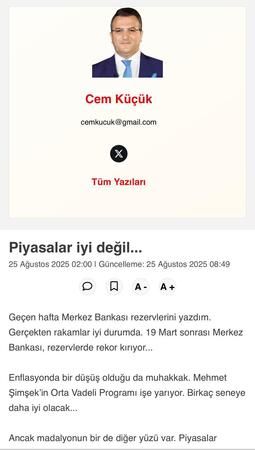 Bu noktada, Türkiye Gazetesi’nde 25 Ağustos 2025 tarihinde yayımlanan “Piyasalar iyi değil…” başlıklı yazısını cesaretle kaleme alabilmiş olan Cem Küçük’ü takdir etmemek elde değil. Çünkü çoğu zaman resmi rakamların pembe tablolar çizdiği bir ortamda, sokağın sesini duymak ve yazıya dökmek kolay değildir. Benim gördüklerim de onun yazdıklarıyla birebir örtüşüyor.