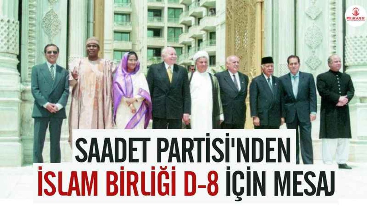 Son yüzyılın en büyük dış politika hamlesi olan D-8’in kuruluşunun 25. yıl dönümü nedeniyle Saadet Partisi sosyal medya hesaplarından “Bizim birliğimiz; bütün insanlığın saadeti için… #YeniBirDünyaD8 D-8'in 25. Kuruluş Yıl Dönümü Kutlu Olsun!” notuyla bir video paylaşıldı.