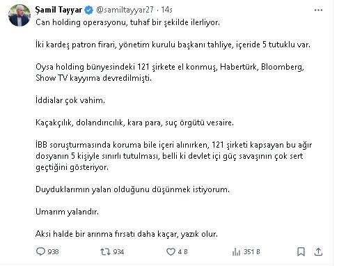 "Can holding operasyonu, tuhaf bir şekilde ilerliyor. İki kardeş patron firari, yönetim kurulu başkanı tahliye, içeride 5 tutuklu var. Oysa holding bünyesindeki 121 şirkete el konmuş, Habertürk, Bloomberg, Show TV kayyıma devredilmişti. İddialar çok vahim. Kaçakçılık, dolandırıcılık, kara para, suç örgütü vesaire. İBB soruşturmasında koruma bile içeri alınırken, 121 şirketi kapsayan bu ağır dosyanın 5 kişiyle sınırlı tutulması, belli ki devlet içi güç savaşının çok sert geçtiğini gösteriyor. Duyduklarımın yalan olduğunu düşünmek istiyorum. Umarım yalandır. Aksi halde bir arınma fırsatı daha kaçar, yazık olur."
