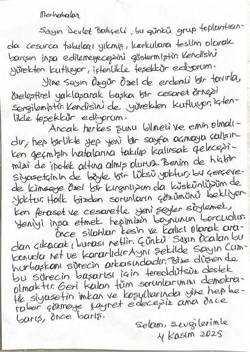 Edirne Cezaevi’nde tutuklu bulunan Halkların Demokratik Partisi (HDP) eski Eş Genel Başkanı Selahattin Demirtaş, yayımladığı mesajında MHP Genel Başkanı Devlet Bahçeli ve CHP Genel Başkanı Özgür Özel’e teşekkür etti.