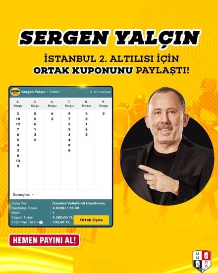 At yarışı tutkusuyla bilinen Yalçın’ın, anlaşmalı olduğu bir bahis sitesinde “Sergen Yalçın, İstanbul 2. Altılısı için ortak kuponunu paylaştı!” notuyla servis edilen kuponu, siyah-beyazlı taraftarlar arasında tepkiyle karşılandı.