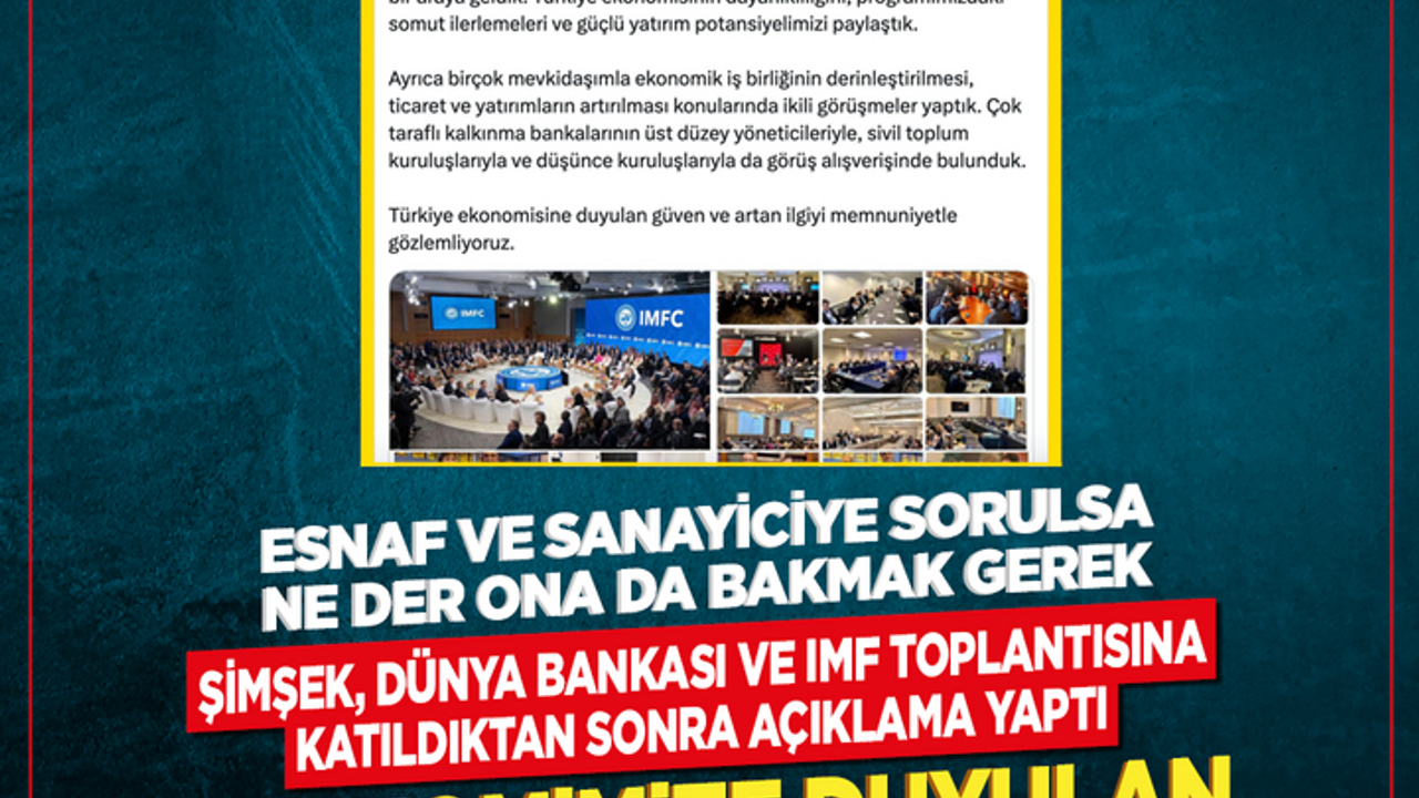 ABD’de gerçekleştirilen Dünya Bankası ve IMF Yıllık Toplantıları ile G20 Maliye Bakanları zirvesine katılan Hazine ve Maliye Bakanı Mehmet Şimşek, temaslarının ardından sosyal medya hesabı üzerinden değerlendirmelerde bulundu. Şimşek, yatırımcılardan sivil toplum kuruluşlarına kadar birçok tarafla temas kurduklarını vurgulayarak, Türkiye'nin ekonomik programına olan ilgiden memnun olduklarını ifade etti. Ancak iç kamuoyunda, özellikle esnaf ve sanayicinin bu gelişmelere nasıl baktığı da ayrı bir merak konusu.