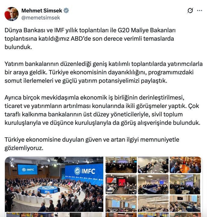Bakan Şimşek, Washington’daki toplantılarda Türkiye ekonomisinin genel görünümüne dair olumlu sinyaller verdiklerini ifade etti. Yatırımcılarla yapılan toplantılarda programdaki ilerlemelerin ve Türkiye’nin yatırım potansiyelinin ön plana çıkarıldığını aktaran Şimşek, “Türkiye ekonomisinin dayanıklılığını, programımızdaki somut ilerlemeleri ve güçlü yatırım potansiyelimizi paylaştık” dedi.