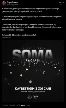 CHP Genel Başkanı Özgür Özel, 13 Mayıs 2014’te meydana gelen ve 301 madencinin yaşamını yitirdiği Soma Maden Faciası’nın 11’inci yıl dönümü dolayısıyla X hesabından paylaşım yaptı. Özel, şunları kaydetti: “301 canımızı, yerin yedi kat dibinde alın teriyle ekmeğini kazanmaya çalışırken göz göre göre gelen bir faciada yitirdik. 11 yıl sonra yüreğimiz ilk günkü gibi yanıyor. 301 madencimiz, bugün de mücadelemizde yaşıyor. Unutmadık, unutturmayacağız. Emekçinin hakkını savunmak, iş cinayetlerini durdurmak ve bir daha hiçbir canı yitirmemek için sonuna kadar mücadele edeceğiz. Bu karanlık düzene boyun eğmeyeceğiz.”