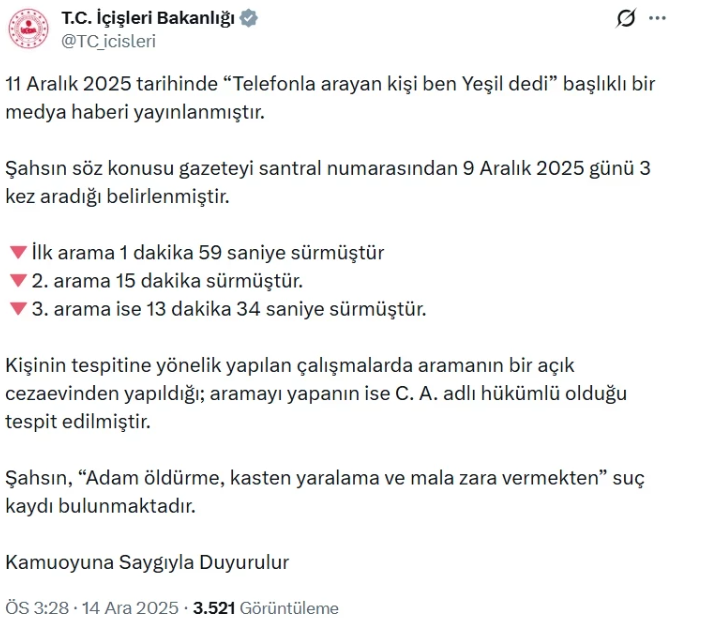 "11 Aralık 2025 tarihinde 'Telefonla arayan kişi ben Yeşil dedi' başlıklı bir medya haberi yayınlanmıştır. Şahsın söz konusu gazeteyi santral numarasından 9 Aralık 2025 günü 3 kez aradığı belirlenmiştir. İlk arama 1 dakika 59 saniye sürmüştür 2. arama 15 dakika sürmüştür. 3. arama ise 13 dakika 34 saniye sürmüştür. Kişinin tespitine yönelik yapılan çalışmalarda aramanın bir açık cezaevinden yapıldığı; aramayı yapanın ise C. A. adlı hükümlü olduğu tespit edilmiştir. Şahsın, 'Adam öldürme, kasten yaralama ve mala zara vermekten' suç kaydı bulunmaktadır. Kamuoyuna saygıyla duyurulur."