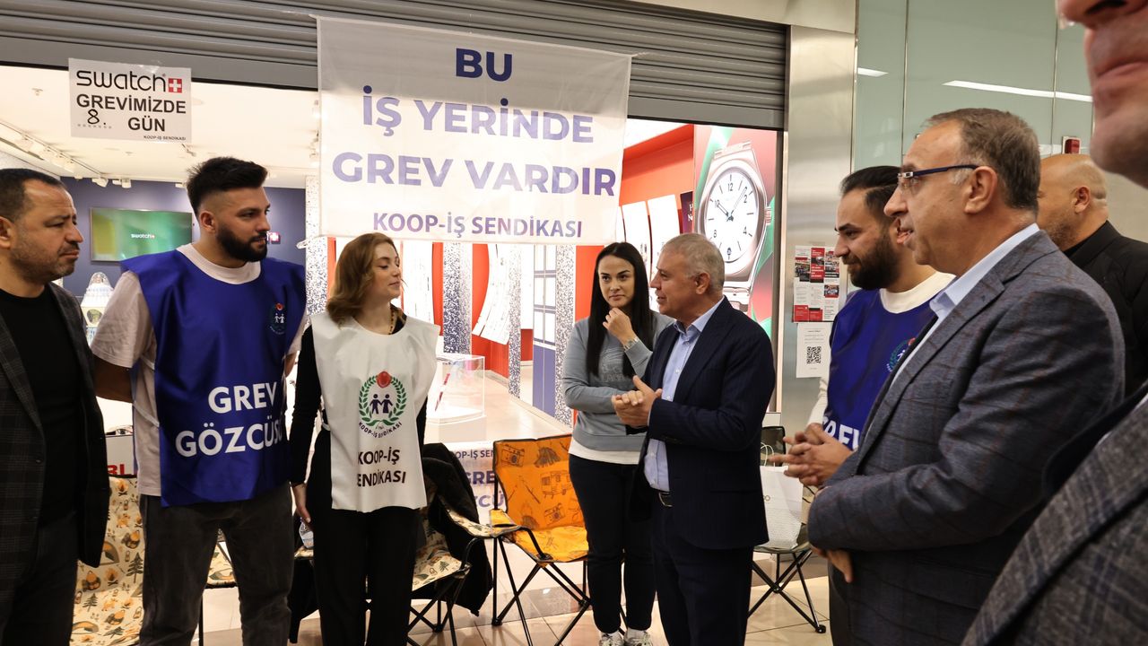 Koop-İş Genel Başkanı Eyüp Alemdar, Ankara'daki grev standını ziyaret etti. Ziyarete ilişkin sosyal medya hesabından paylaşım yapan Alemdar, şunları kaydetti: "İnsan onuruna yaraşır bir yaşam ve adil bir ücret için greve çıkan Swatch Türkiye’deki üyelerimizi Ankamall Swatch mağazasında ziyaret ettim. Grevimizin 8'inci gününde üyelerimiz heyecanları ve enerjileri ile greve devam ediyor. Onların kararlı duruşu, onurlu mücadelesi ve birlik içinde sergiledikleri yüksek irade hepimiz için büyük bir gurur kaynağıdır. Bu sürecin sonuna kadar yanlarında olmaya, güçlerine güç katmaya devam edeceğiz. Direne, direne kazanacağız."