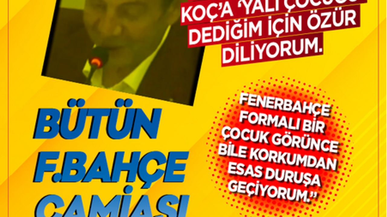 - Arkadaşlar, yalı çocuğu dediğim için özür diliyorum. Şımarıklığı demedim, yalı çocuğu dedim özür diliyorum. Haddimi aşmışım. Ama Fenerbahçe camiasına asla bir laf söylemedim söylemem.