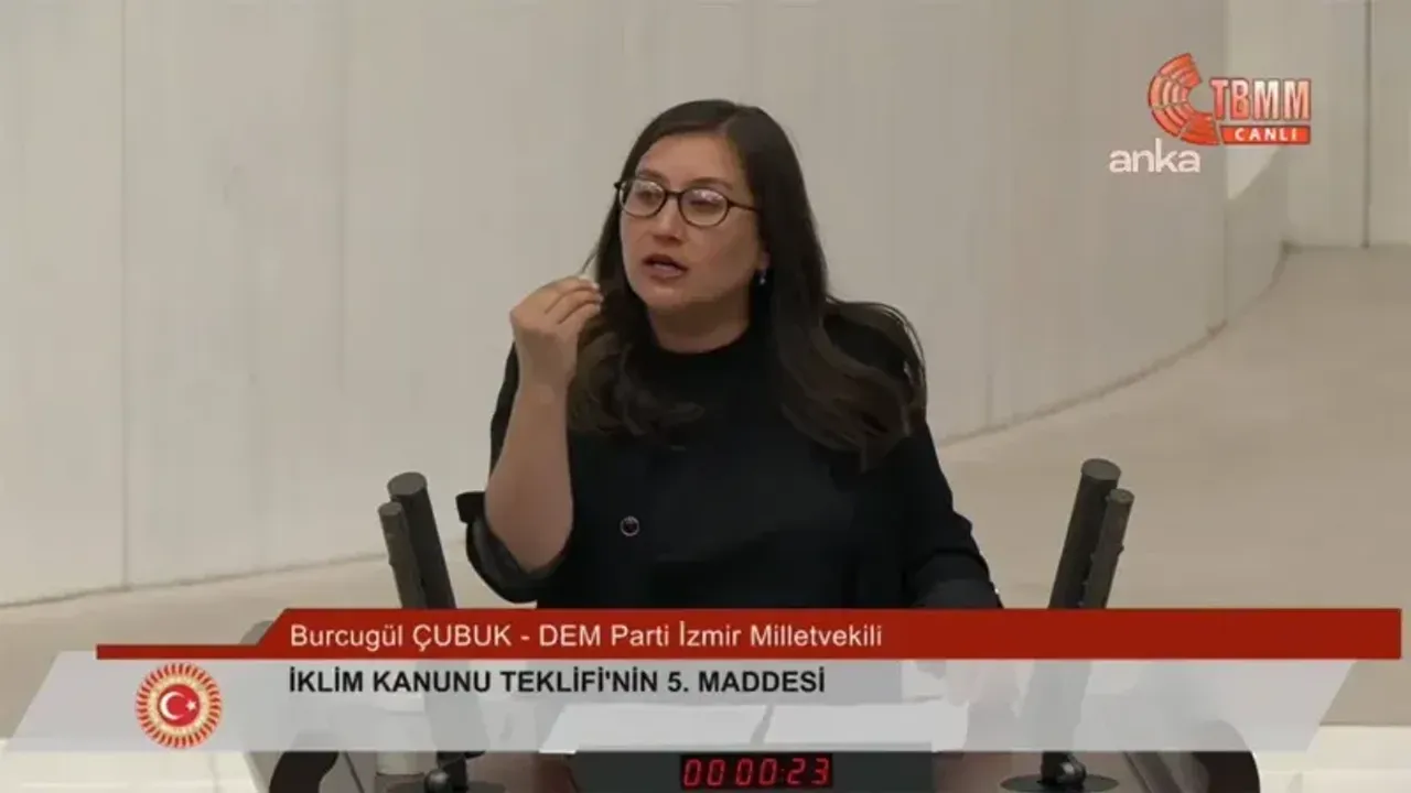 TBMM Genel Kurulu'nda Nisan ayında görüşmelerine başlanan ancak muhalefet ve toplumsal kesimler tarafından bazı maddeleri tepki çeken İklim Kanunu Teklifi yeniden Meclis gündemine alınmıştı. Teklifin 5. maddesi üzerine söz alan DEM Parti İzmir Milletvekili Burcugül Çubuk, konuşmasının ardından kürsüden ayrılırken doğa katliamcılarına hitaben Kürtçe "Allah belanızı versin" dedi.