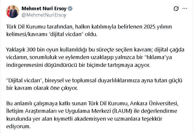 Türk Dil Kurumu (TDK) tarafından, vatandaşların doğrudan katılımıyla yapılan oylamada 2025 yılının kelimesi ve kavramı seçildi. Kültür ve Turizm Bakanı Mehmet Nuri Ersoy, yaptığı açıklamada "Türk Dil Kurumu tarafından, halkın katılımıyla belirlenen 2025 yılının kelimesi/kavramı 'dijital vicdan' oldu" ifadelerini kullandı.