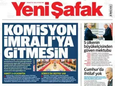 Yeni Şafak, haberinde Milli Dayanışma, Kardeşlik ve Demokrasi Komisyonu’nun Abdullah Öcalan’la görüşmesi ihtimali üzerinden bir kamuoyu araştırmasını öne çıkarmış, ankette vatandaşların yüzde 76,7’sinin bu görüşmeye karşı olduğu belirtilmişti.