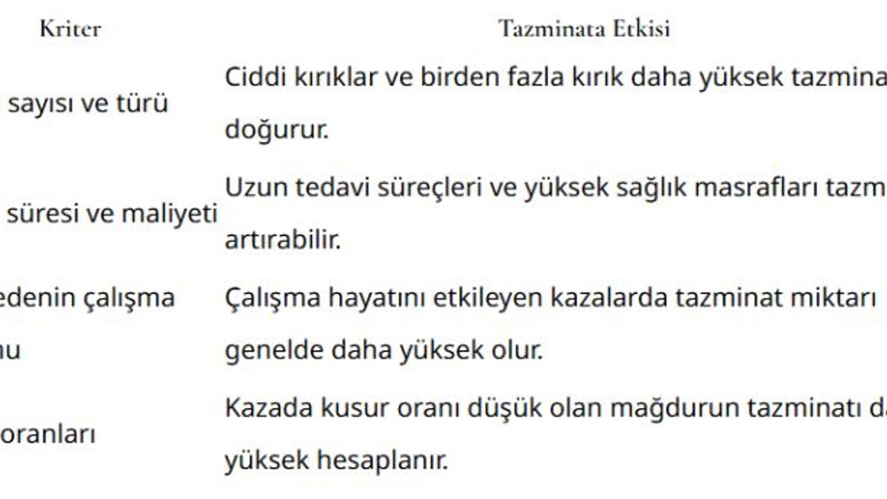 Trafik kazası kırık tazminatı, mağdur kişinin yaralanmasının ciddiyeti, meslek hayatı üzerindeki etkisi ve tedavi sürecinin uzunluğu gibi kriterler doğrultusunda belirlenir. Bunun yanı sıra, kazanın meydana gelme şekli ve kusur oranları da tazminat miktarını etkiler. Aşağıda temel kriterlere göre tazminat hesaplamasına ilişkin bir tablo sunuyoruz: