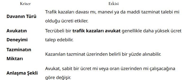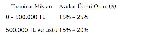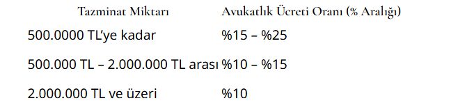 Aşağıda, trafik kazası tazminat davalarında avukatlık ücretlerine dair genel bir tabloyu inceleyebilirsiniz: