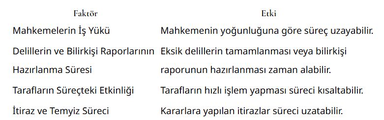 Aşağıdaki tablo, trafik kazası tazminat davalarının süresini etkileyen en temel faktörleri göstermektedir: