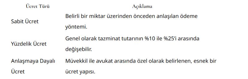 Öncelikle, avukatlık ücretlerinde iki temel yaklaşım bulunur: sabit ücret ve yüzdelik oran. Sabit ücret, avukatın davaya başlamadan önce belirlenen ve taraflar arasında mutabakata varılan bir meblağı ifade eder. Bunun yanı sıra, yüzdelik ücret yöntemi ile avukatlar, kazanılan tazminat miktarından belirli bir yüzde oranında ücret alabilir.