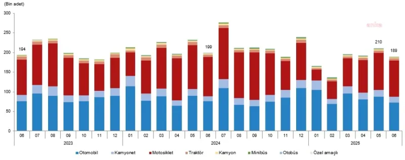 TÜİK, haziran ayına ilişkin "Motorlu Kara Taşıtları" istatistiklerini açıkladı. Buna göre, haziran ayında trafiğe kaydı yapılan taşıtların yüzde 48,7'sini motosiklet, yüzde 38,2'sini otomobil, yüzde 7,8'ini kamyonet, yüzde 3,1'ini traktör, yüzde 1,3'ünü kamyon, yüzde 0,6'sını minibüs, yüzde 0,2'sini otobüs ve yüzde 0,1'ini özel amaçlı taşıtlar oluşturdu.