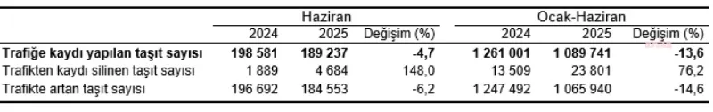 Ocak-Haziran döneminde bir önceki yılın aynı dönemine göre trafiğe kaydı yapılan taşıt sayısı yüzde 13,6 azalarak 1 milyon 89 bin 741 adet olurken, trafikten kaydı silinen taşıt sayısı yüzde 76,2 artarak 23 bin 801 adet oldu. Böylece Ocak-Haziran döneminde trafikteki toplam taşıt sayısında 1 milyon 65 bin 940 adet artış gerçekleşti.