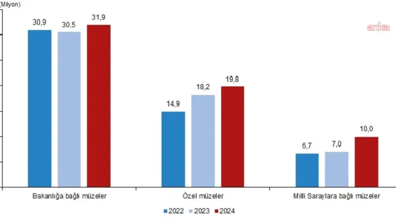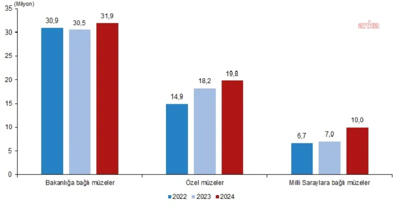 Müze ve ören yeri ziyaretçi sayısı, 2024 yılında yüzde 10,6 artarak 61 milyon 687 bin 726 oldu. Ziyaretçilerin yüzde 51,7'si Bakanlığa bağlı müze ve ören yerlerini ziyaret etti. Bakanlığa bağlı ücretli müze ve ören yerlerini ziyaret edenlerin sayısı 18 milyon 995 bin 286 ve toplam ziyaretçiler içindeki payı yüzde 30,8 oldu. Özel müze ziyaretçi sayısı yüzde 8,4 artarak 19 milyon 774 bin 549 olurken Milli Saraylar Başkanlığına bağlı müze ziyaretçi sayısı yüzde 42,3 artarak 9 milyon 999 bin 370 oldu.