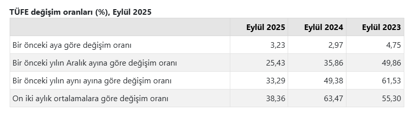 TÜFE'deki (2003=100) değişim 2025 yılı eylül ayında bir önceki aya göre yüzde 3,23 artış, bir önceki yılın aralık ayına göre yüzde 25,43 artış, bir önceki yılın aynı ayına göre yüzde 33,29 artış ve on iki aylık ortalamalara göre yüzde 38,36 artış olarak gerçekleşti.