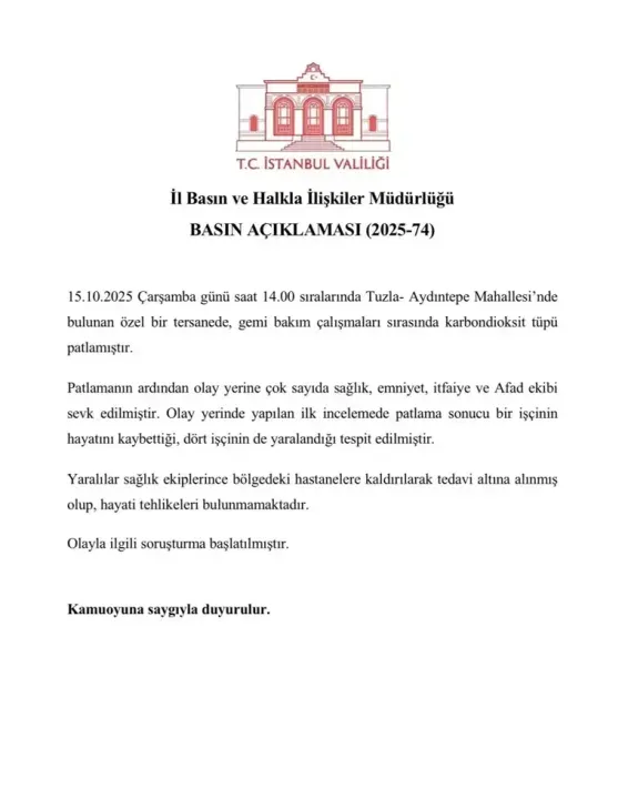 "Çarşamba günü saat 14.00 sıralarında Tuzla - Aydıntepe Mahallesinde bulunan özel bir tersanede, gemi bakım çalışmaları sırasında karbondioksit tüpü patlamıştır. Patlamanın ardından olay yerine çok sayıda sağlık, emniyet, itfaiye ve Afad ekibi sevk edilmiştir. Olay yerinde yapılan ilk incelemede patlama sonucu bir işçinin hayatını kaybettiği, dört işçinin de yaralandığı tespit edilmiştir. Yaralılar sağlık ekiplerince bölgedeki hastanelere kaldırılarak tedavi altına alınmış olup, hayati tehlikeleri bulunmamaktadır. Olayla ilgili soruşturma başlatılmıştır."