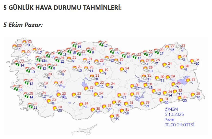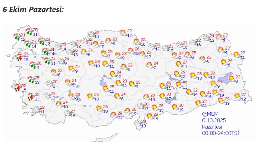 MGM’nin yayımladığı haritalara göre, hafta başında sıcaklıklar mevsim normallerinin üzerinde seyredecek. Ülke genelinde hava sıcaklıklarının 20 ila 30 derece, bazı bölgelerde ise 33 dereceye kadar çıkması bekleniyor.