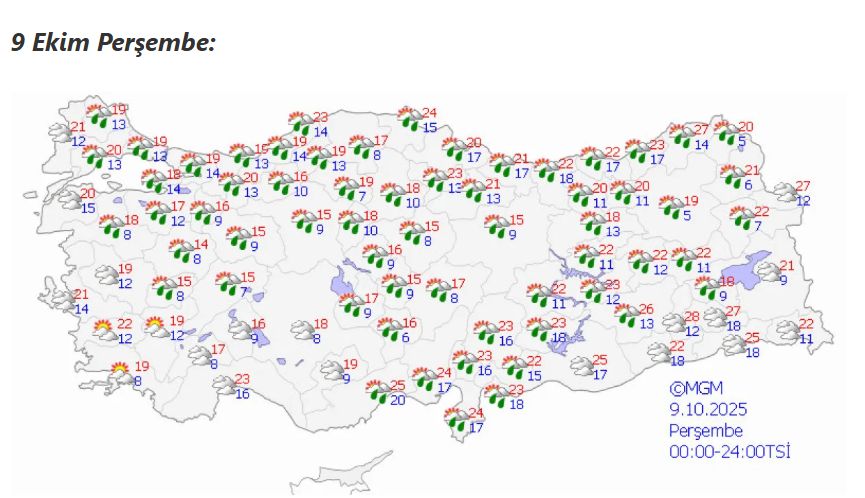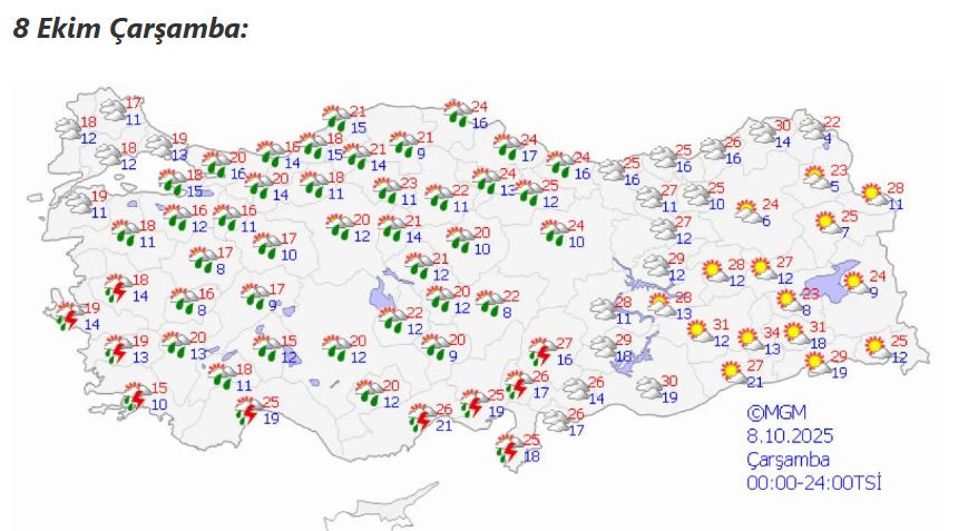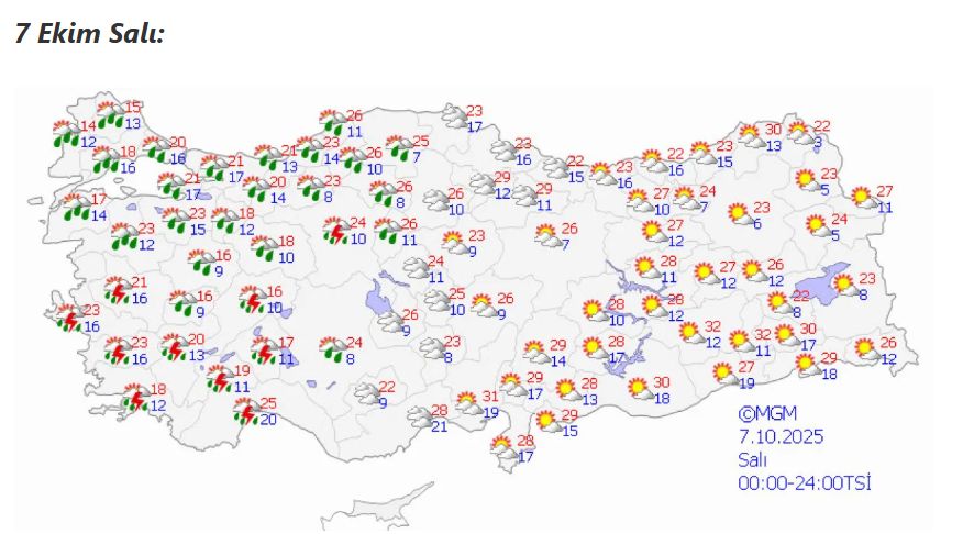 Bugün yurdun batı ve iç kesimlerinde yer yer sağanak ve gök gürültülü yağışlar, doğu bölgelerde ise az bulutlu ve açık hava hakim olacak. Marmara, Ege ve İç Anadolu’da 20-32 derece, Karadeniz ve Akdeniz’de 23-30 derece aralığında sıcaklık tahmin ediliyor.