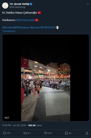 T.C. Şırnak Valiliği resmi X hesabı, "Harikasınız #BizimÇocuklar #ŞırnaktaMilliHeyacan #Şırnak #EURO2024" mesajıyla 51. dakikada Hakan Çalhanoğlu'nun attığı gole meydandaki halkın sevincinin görüntülerini yayınladı.