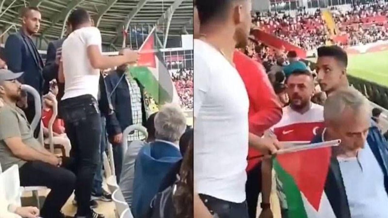 Erzincan’da oynanan Avrupa Grup Elemesi Azerbaycan-Türkiye kadın futbol maçında, Filistin bayrağı açan bir vatandaş, birileri tarafından engellenmeye çalışıldı.