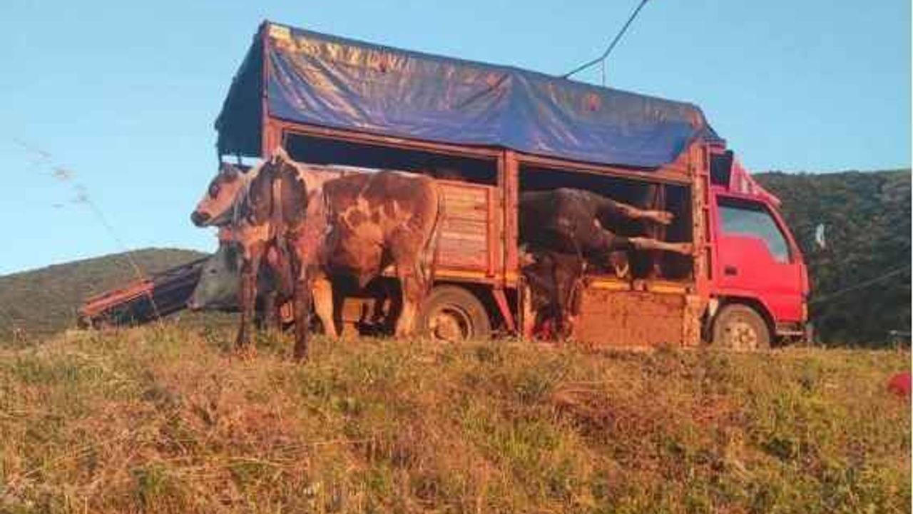Bursa’nın İznik ilçesinde bir kamyonete üst üste bindirilip kurban pazarına götürülen boğalar kavga edince ortalık arenaya döndü.