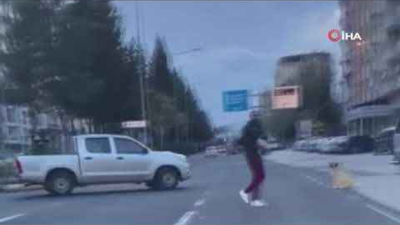 Yavru köpek kavşakta akıcı trafiğin olduğu bulvarın orta kısmına kadar ilerledi. Arkasından gelen anne köpek yavrusuna araçlar nedeniyle yaklaşamadı. Çaresiz bir...