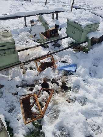 Düzce’de aralıklarla yağan kar yağışı nedeniyle yer yer 1 metreye ulaşan kar kalınlığı sonrasında Doğa Koruma ve Milli Parklar ekipleri ormanlarda yaban hayatı yemlerken, Düzce’nin Gümüşova ilçesinde aç kalan ve yiyecek bulmak için Yongalık köyüne inen ayı, kovanlara dadandı. Ayı bir çok bal kovanını tahrip etti.